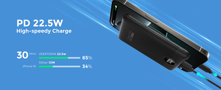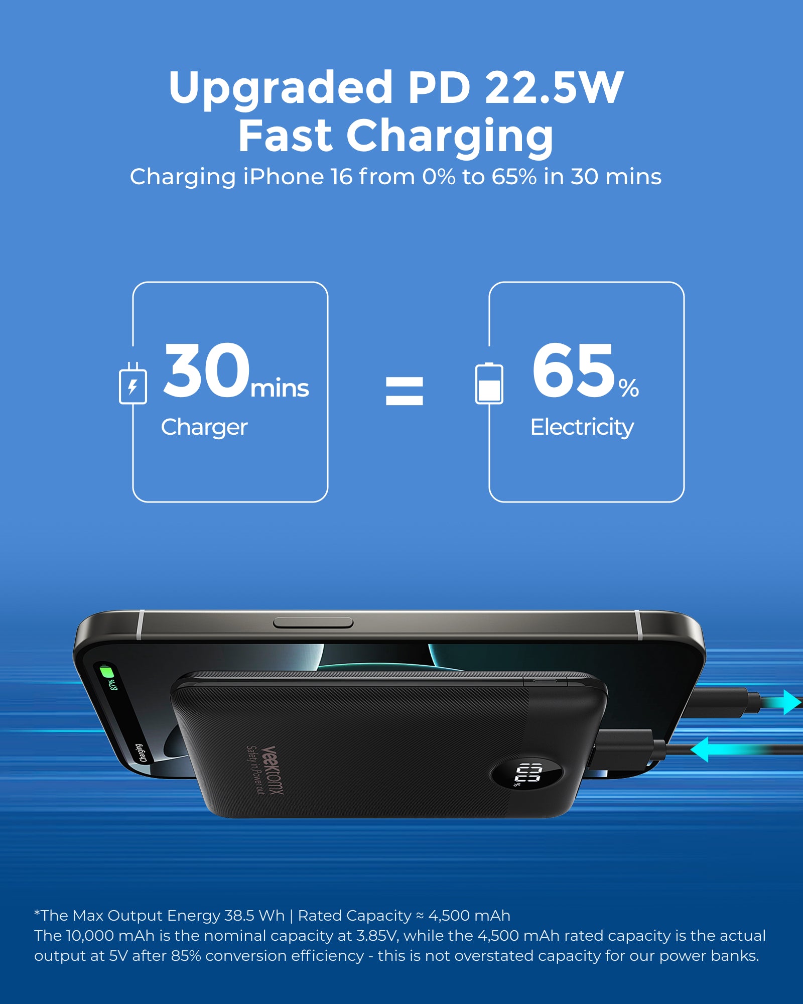 [ Super-Fast Charging ] Featuring with dual PD 3.0 and QC 3.0 fast charging technologies, this portable power bank can deliver up to a blazing 22.5W of max output power. Charge your devices up to 2 times faster compared to standard chargers, charging your iPhone 15 or Samsung S24 from 0% to 45% in just 30 minutes. The fast charging portable charger power bank itself recharges from 0% to full capacity in just 3 hours.