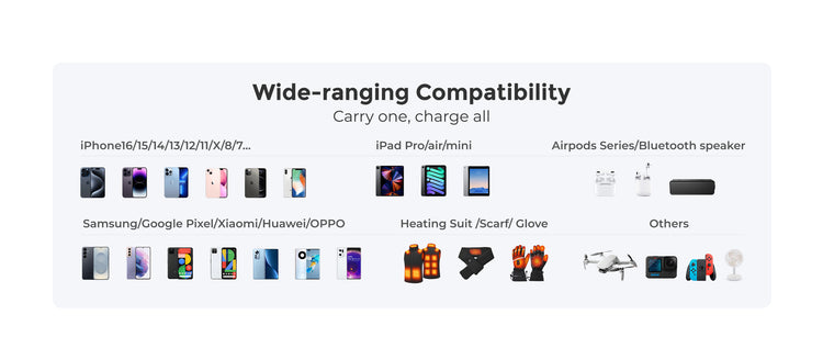 [ Wide Compatibility ] The USB C power bank for iPhone equipped with Dual USB-A and USB C ports compatible with a wide range of devices including iPhone 16/15/14/13/12/11/X/8/7, Samsung Galaxy S24/S23/S22/S21 Galaxy Z Flip/Z Fold/Galaxy A51/52/53/54, and other USB C devices such as smartphones, iPad, tablets, headphones, USB lights, USB fans, heated vests jackets, and more. It's a versatile charging companion for all your on-the-go needs.